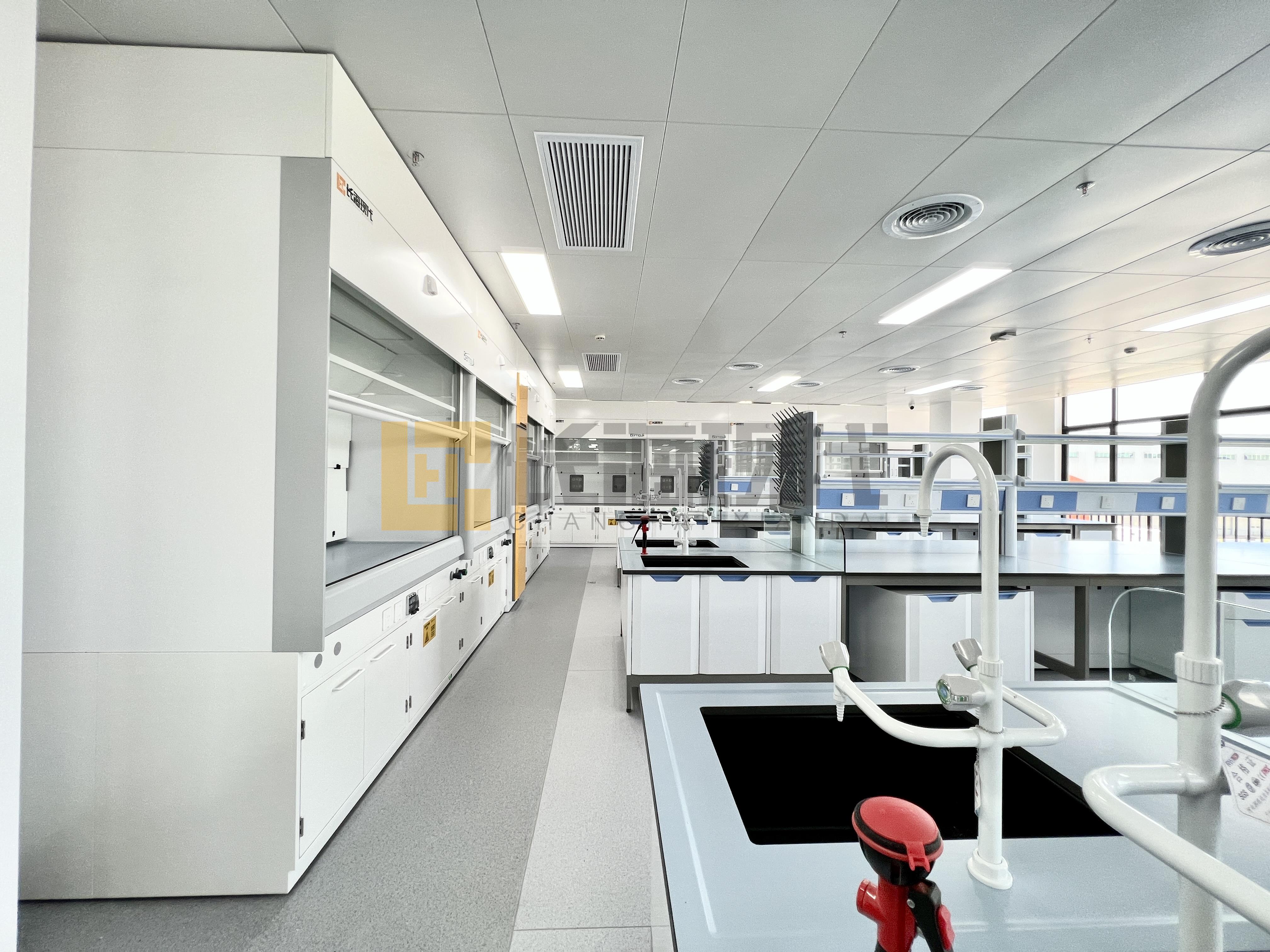 (3) 內(nèi)襯板、導(dǎo)流板材料為5mm厚陶瓷纖維板,可安裝水嘴、氣嘴、插座等,設(shè)有檢修口。導(dǎo)流采用三段式設(shè)計,符合BS標(biāo)準(zhǔn),有效的疏導(dǎo)氣流流通,能避免氣流在通風(fēng)柜內(nèi)形成渦流。